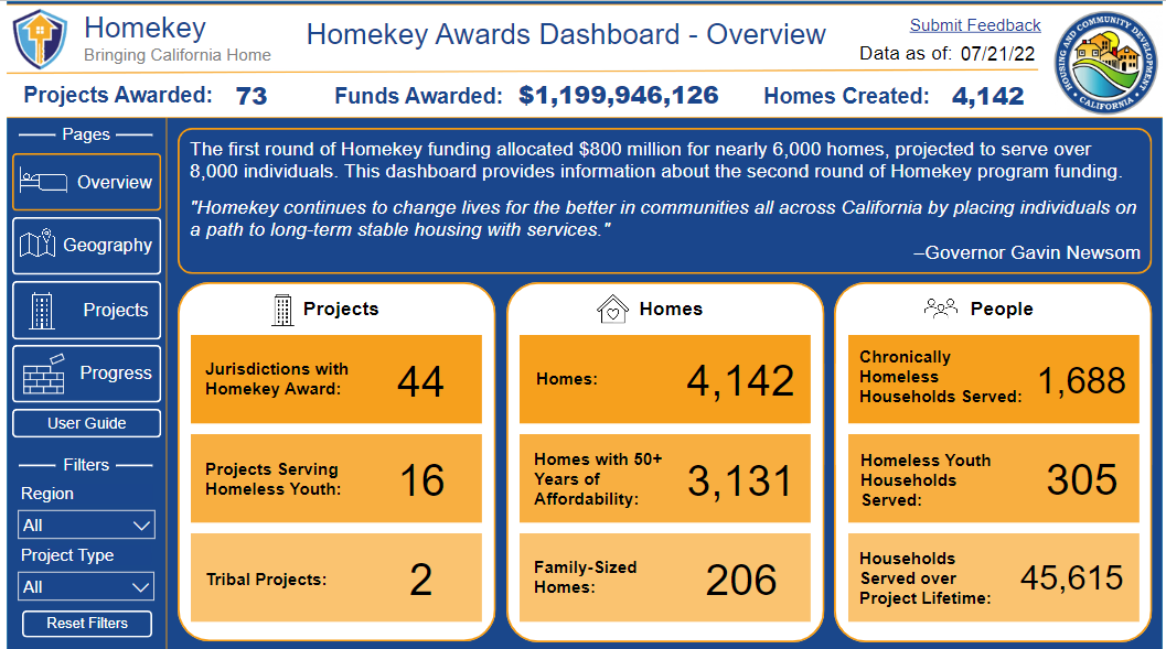 Homekey Program - The Homekey Program is one of the active programs you’ll find in the directory, and for owners, developers, and community organizations that desire to bring affordable housing solutions to their communities, this innovative program can fast-track the funding and encourage your team to creatively design an expedited project, that can proceed from funding to occupancy in less than 12 months. It’s a worthy challenge, with a rich reward for those committed to creating long-term secure affordable housing solutions. In the past 8 months, this program awarded nearly 1.2 billion dollars to 73 projects across the state, providing more than 4,100 homes, nearly half of which are service chronically homeless and homeless youth.